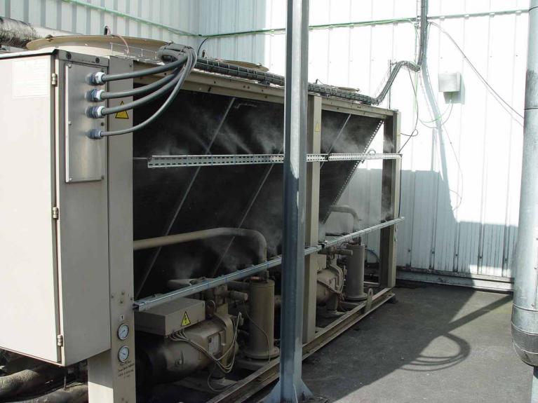 Les brumisateurs permettent de baisser la température au niveau des entrées des groupes de condenseurs ou aéroréfrigérants. Lorsque la température extérieure est caniculaire et que l'air entrant dans les groupes fait monter la charge dans ce cas les installation de brumisateur se mettent en marche la brumisation à contre-courant du flux d’air, l’air est ainsi refroidi par l’évaporation de l’eau. Ceci optimise l’échange thermique sur les batteries de refroidissement. La brumisation haute pression ajuste au minimum la consommation d’eau dans le respect de la sécurité sanitaire et simplifie les démarches des techniciens de maintenance. Sa fiabilité pour palier aux fortes températures extérieures en fait un atout pour vous, gestionnaires de grands ensembles de commerce.